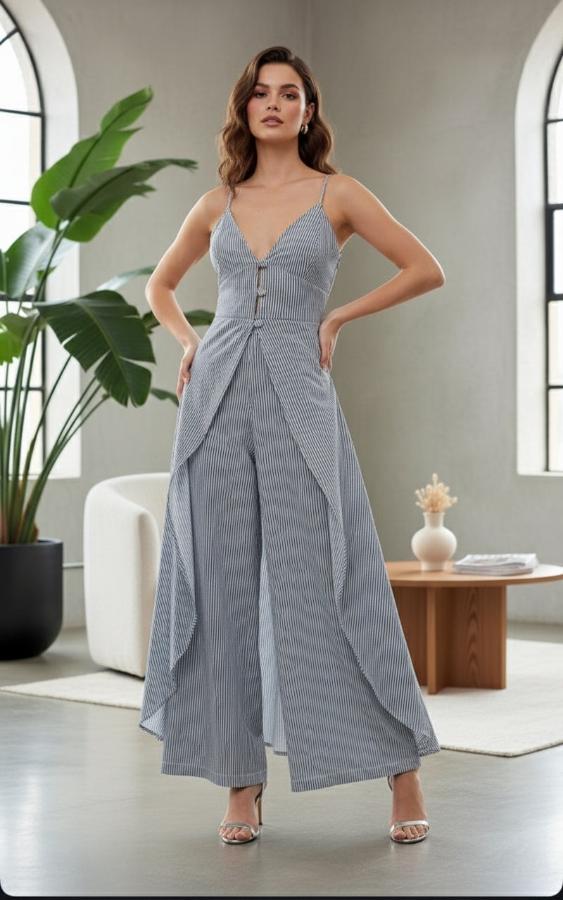 El set Aurora Con rayas verticales en blanco y negro que estilizan la silueta, un top con tirantes finos y escote en “V”, además de delicados botones frontales, cada detalle resalta un estilo chic y femenino. Su Top estilo falda en cascada revela un pantalón palazzo fluido, creando un look sofisticado, fresco y lleno de movimiento digno de una princesa fashionista. Corre su talla regular