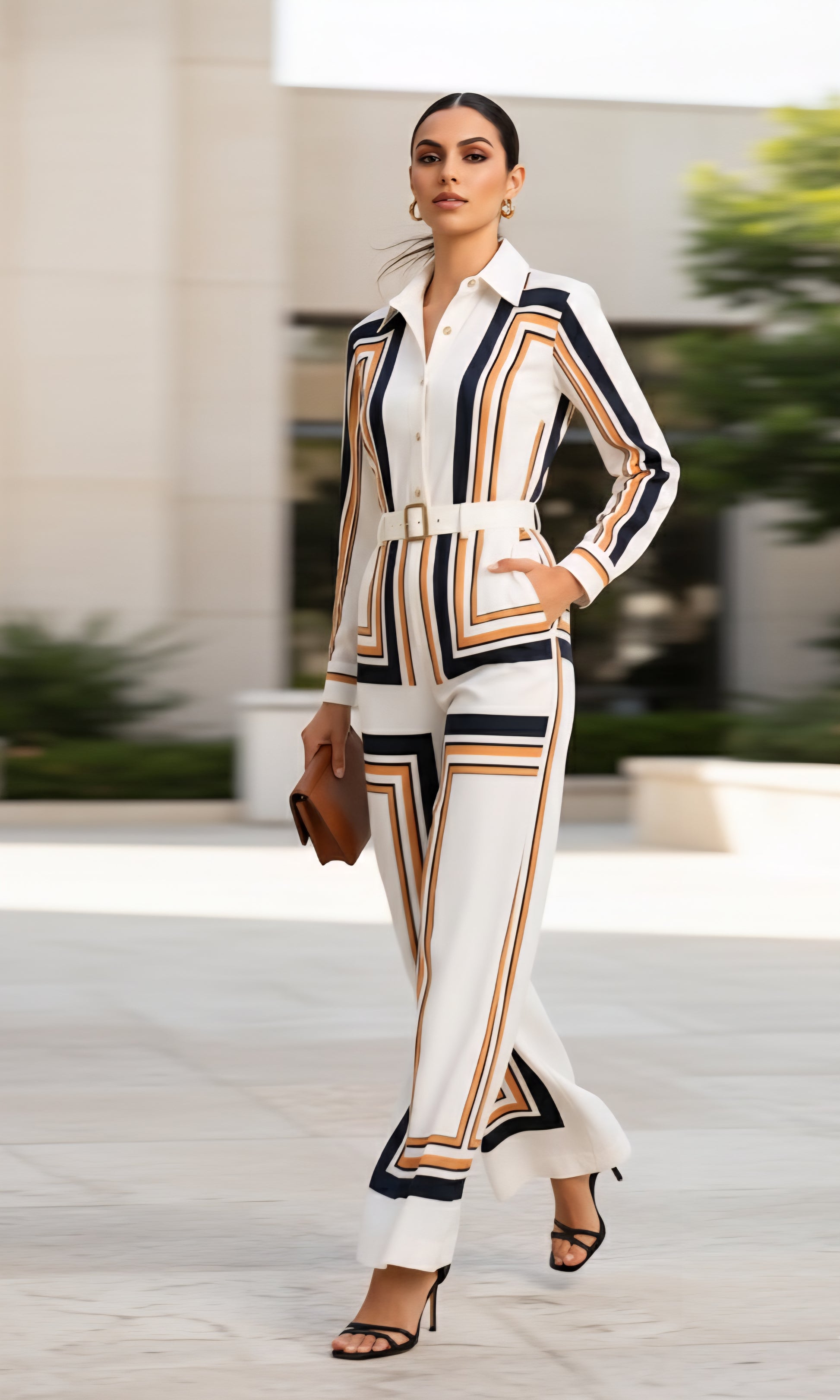 Este elegante conjunto de pantalón y blusa es perfecto para un look sofisticado y moderno. La blusa de manga larga tiene un diseño de líneas verticales en colores blanco, negro, y naranja que estilizan la figura, mientras que los pantalones a juego presentan un patrón geométrico que crea una silueta única y llamativa.