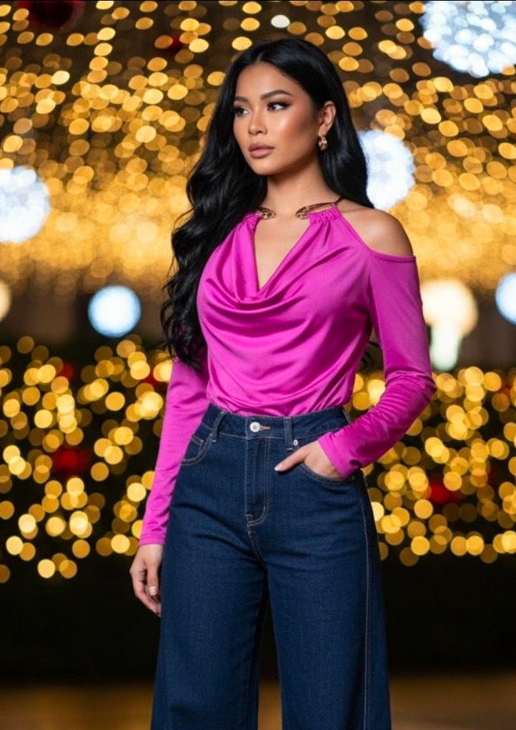 Blusa de mang.a larga con hombros descubiertos y caída suave al frente. Confeccionada en tela stretch que se ajusta cómodamente al cuerpo. Incluye collar dorado integrado que añade un toque elegante y sofisticado, ideal para elevar cualquier look con denim o pantalones de vestir.