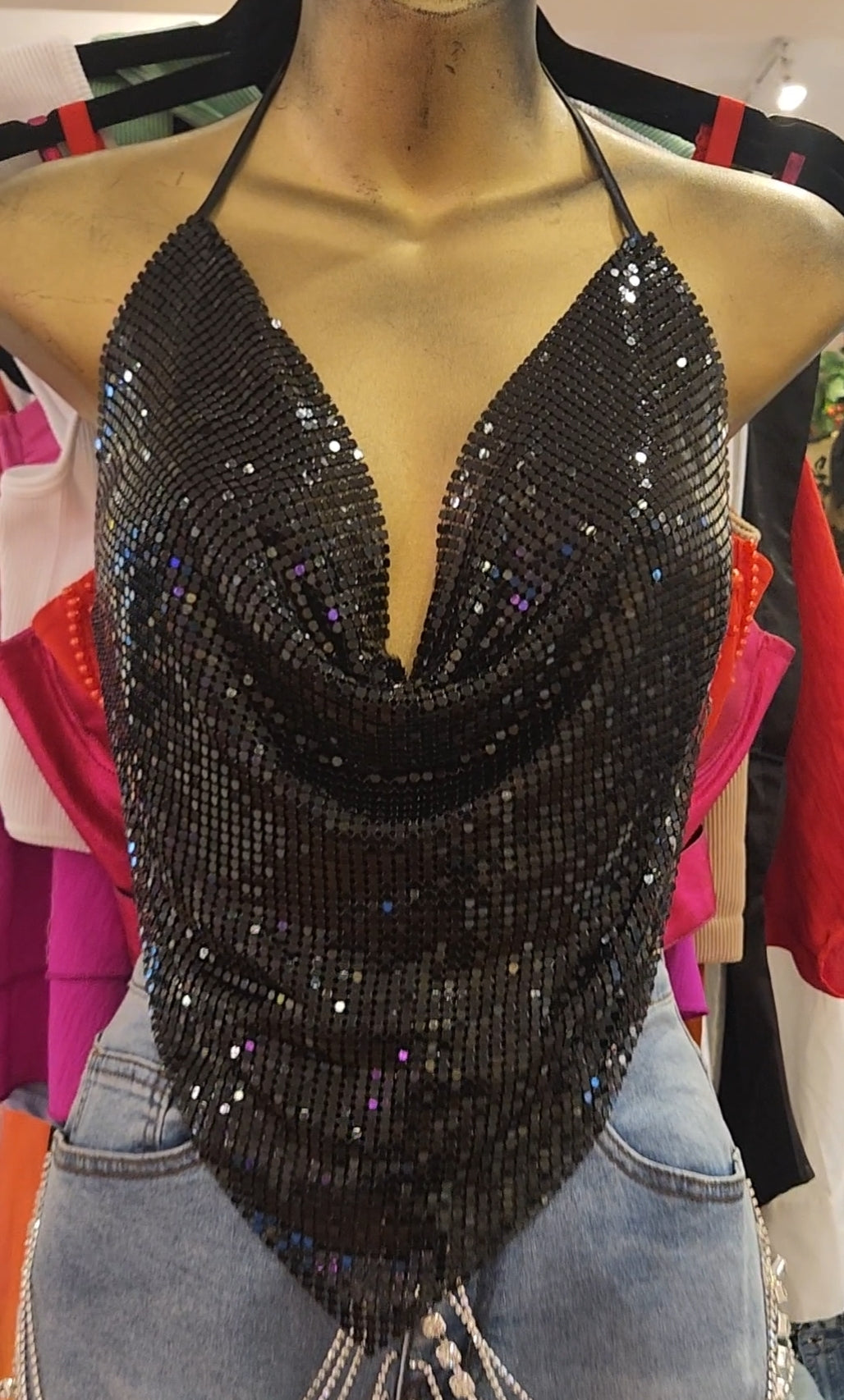 Top confeccionado con malla de lentejuelas negras con brillo metalico con forro en su interior. Presenta un escote en forma de V con tirantes que se atan detras del cuello y espalda. Talla Unica