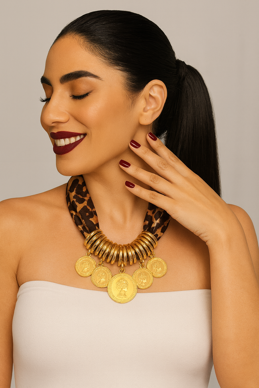 Collar statement de inspiración glam con cinta ancha en estampado animal print que aporta un aire audaz y sofisticado. Al frente, luce aros dorados que sostienen una serie de dijes en forma de monedas doradas, evocando lujo y poder. Su diseño llamativo convierte esta pieza en el accesorio perfecto para elevar un look sencillo y transformarlo en un outfit de impacto. Ideal para mujeres seguras, modernas y fashionistas que buscan destacar con estilo único. ✨ puedes ajusta el largo deseado