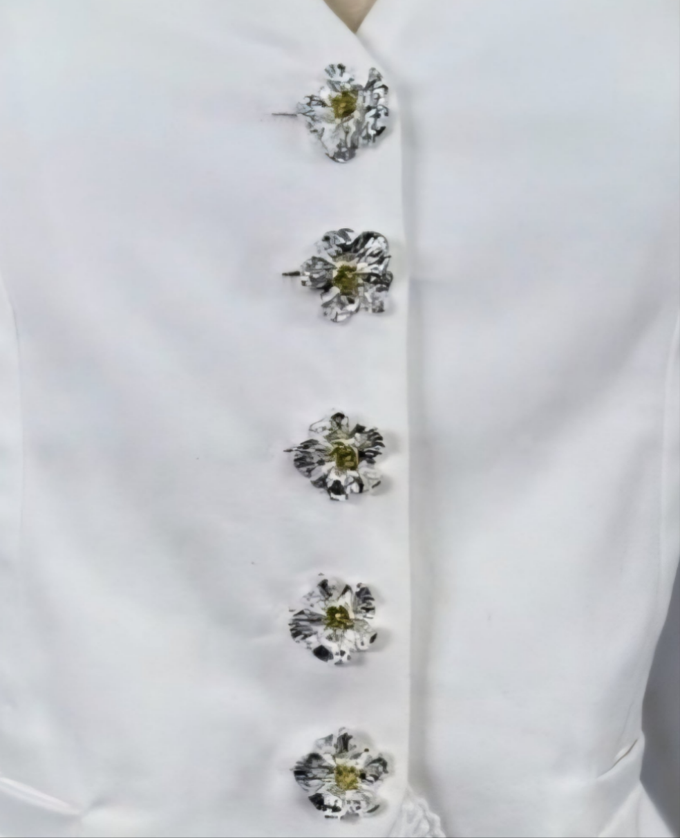 Vest en color blanco, con acabado elegante. Presenta cuello en “V”, cinco botones frontales en forma de flor con incrustaciones brillantes que le dan un toque sofisticado. El corte es entallado para definir la cintura y termina en un delicado ribete de encaje floral en el dobladillo, que aporta feminidad y detalle romántico a la prenda. Ideal para looks formales o chic casual, perfecta para combinar con pantalones de vestir, faldas o denim de talle alto. Corre a sus talla regular